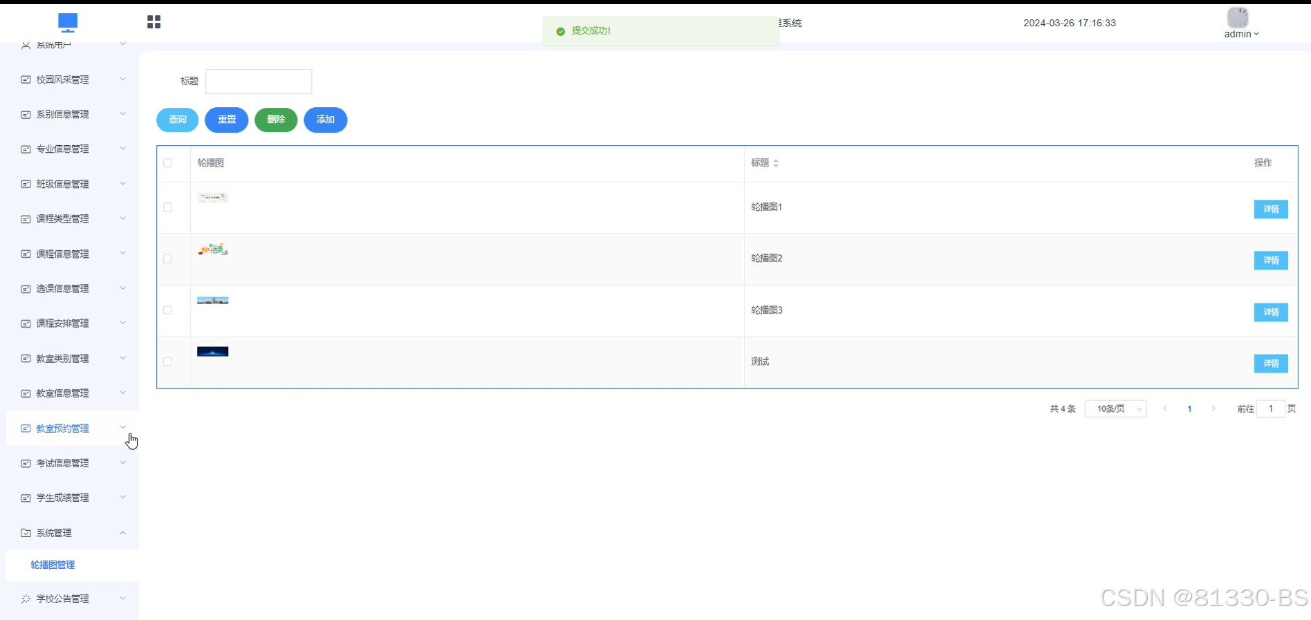 管理员可以对系统前台展示的轮播图进行增删改查,方便用户进行查看。系统管理界面如下图所示。
