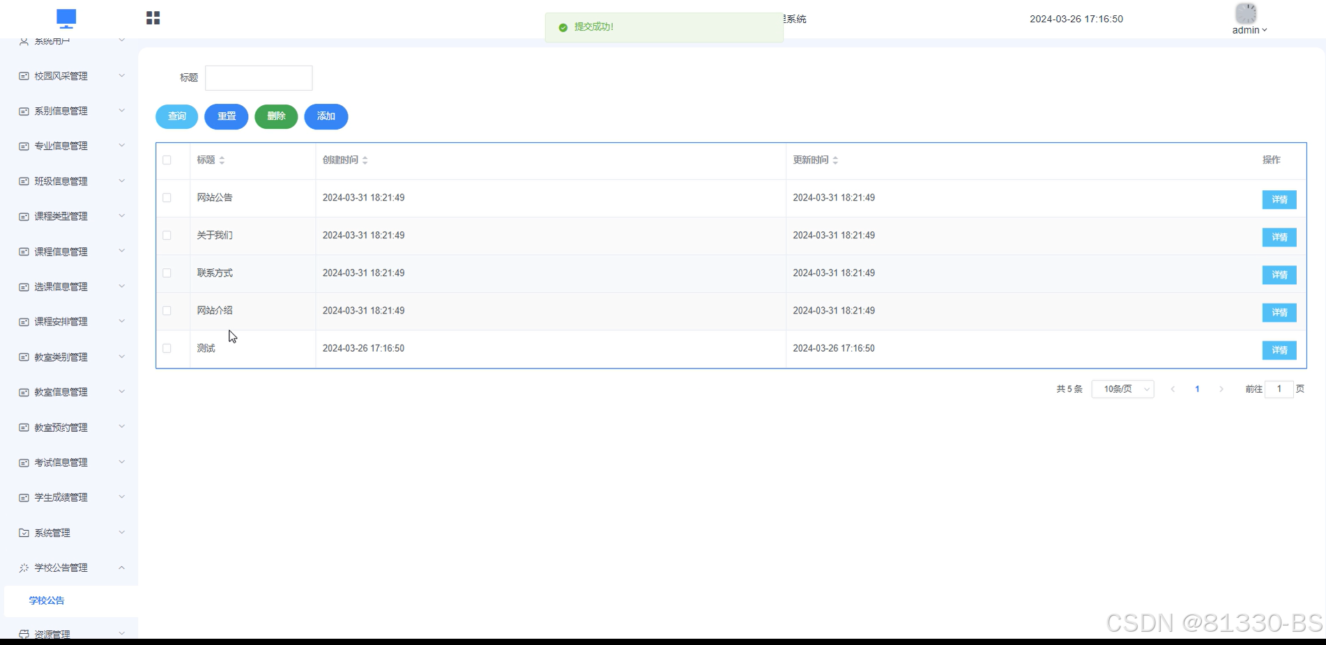 图5-12学校公告管理界面