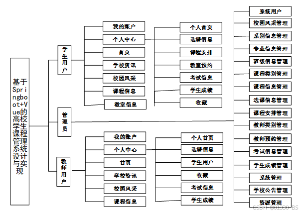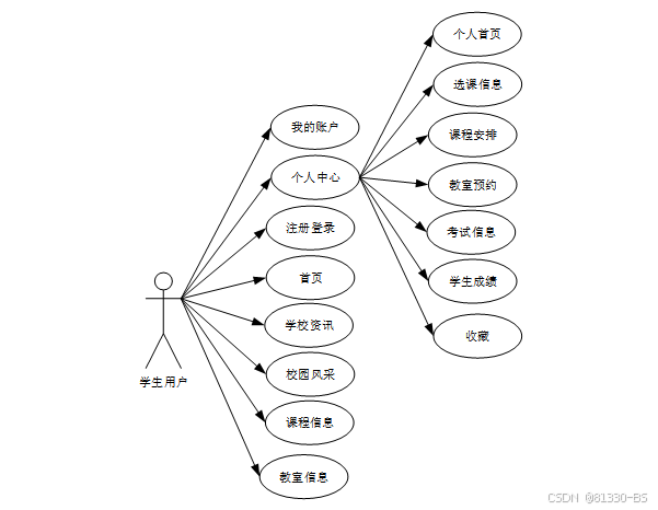 学生用户模块功能有:我的账户、个人中心(个人首页、选课信息、课程安排、教师预约、考试信息、学生成绩、收藏)、首页、学校公告、学校资讯、校园风采、课程信息、教室信息。