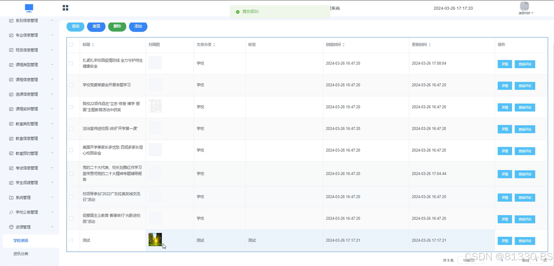| 学校资讯1 | A | 1 | 添加成功 | |