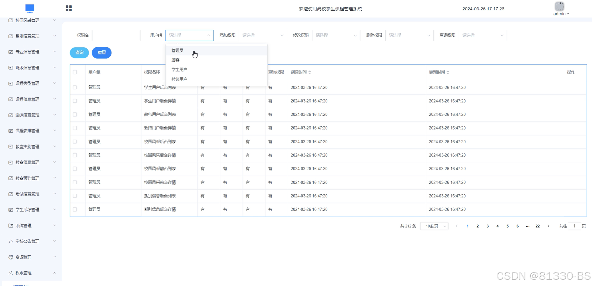 管理员可以对所有的用户进行权限分配。权限管理界面如所示。