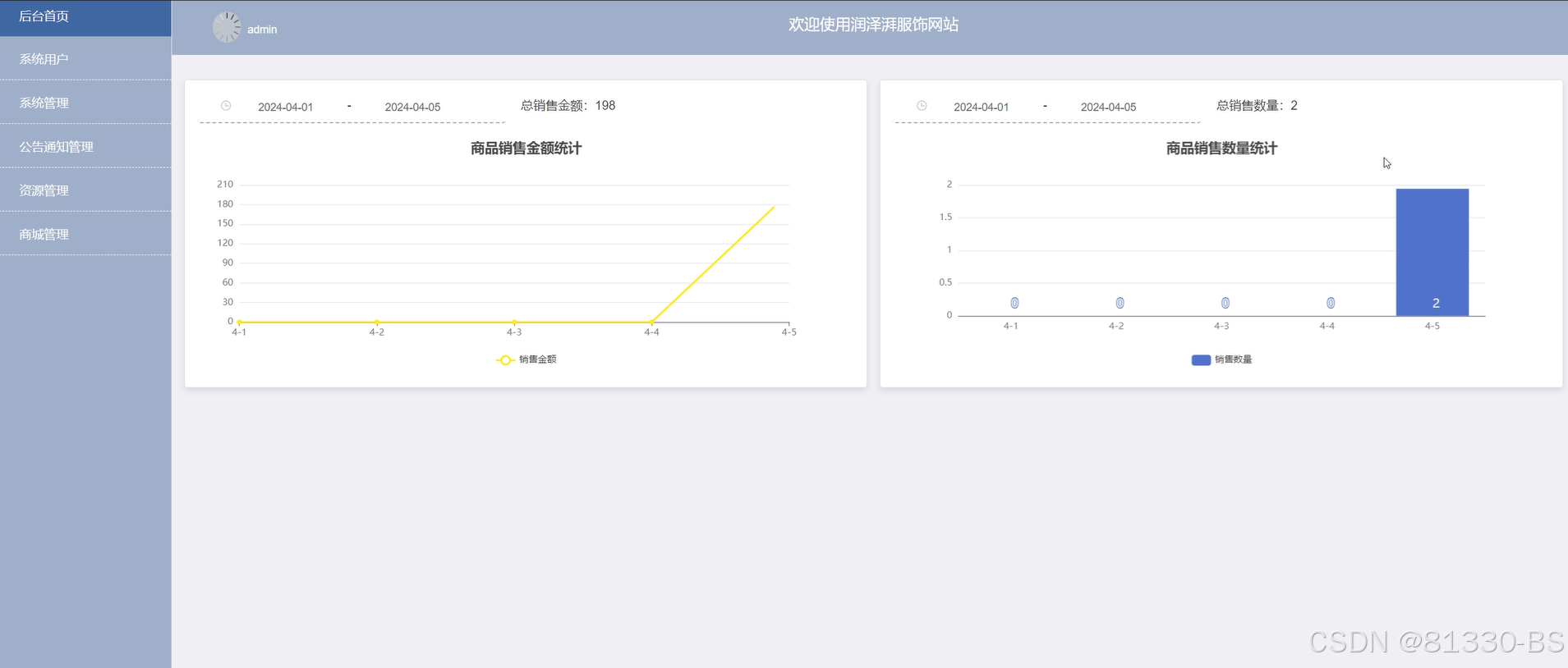 (2)后台首页:管理员在此页面可以页面的商品销售金额统计、商品销售数量统计管理网站的数据情况,统计图根据模块数据统计。