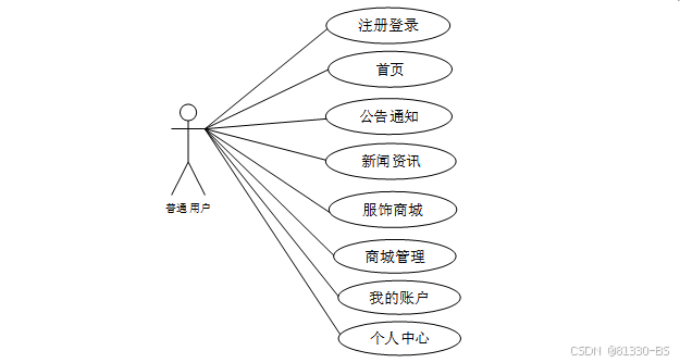 系统的用例展示的是系统功能与用户之间的关系,通过用例的方式能够直观的展示出来,本PHP润泽湃服饰网站的完整UML用例图分别是图2-1、图2-2。