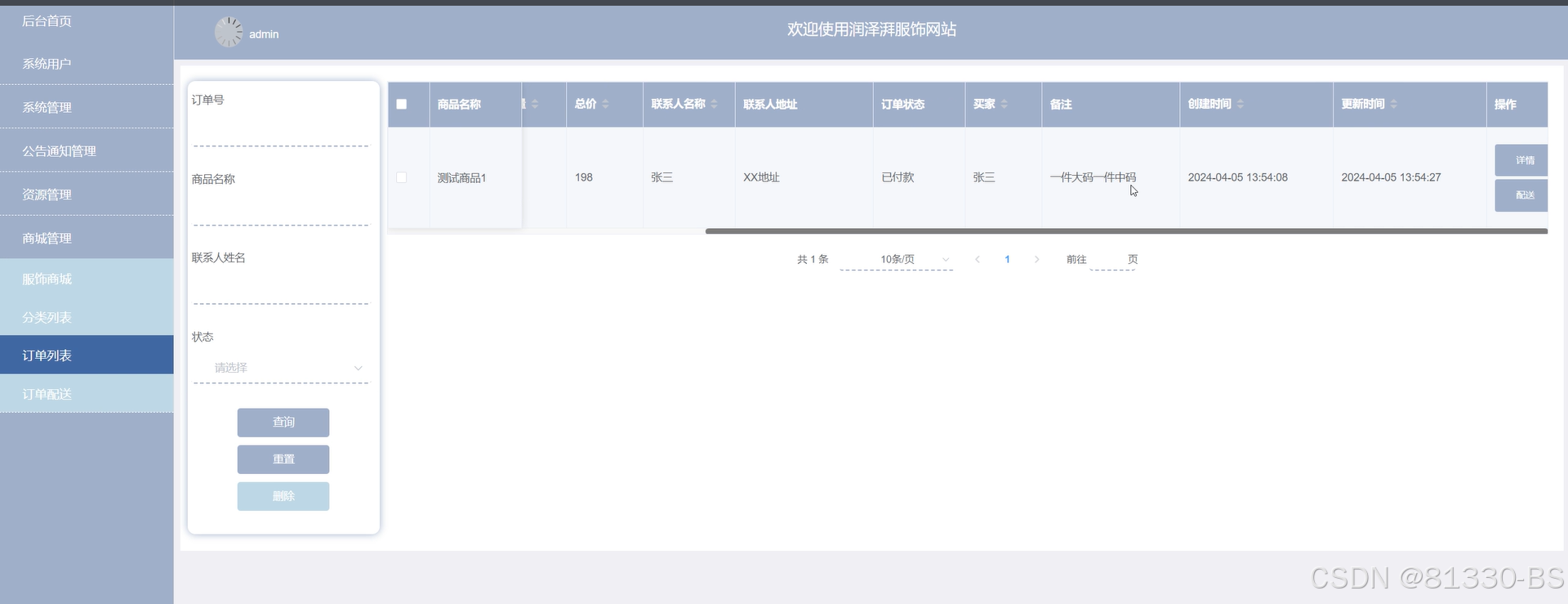 (7)商城管理:管理员点击“商城管理”菜单呈现服饰商城、分类列表、订单列表、订单配送等子菜单,可点击进入详情进行相应的管理。