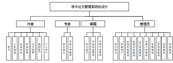 系功能模块的设计就是把系统具体要实现哪些功能,功能如何划分做一个系统的架构,以模块图的方式展示出来,方便我们进行功能得罗列以及涉及。在系统的功能方面,项目分成了管理员+作者+编辑+专家四个模块,每个模块登录进去对应相应的功能,具体的功能模块图如图3.1所示。