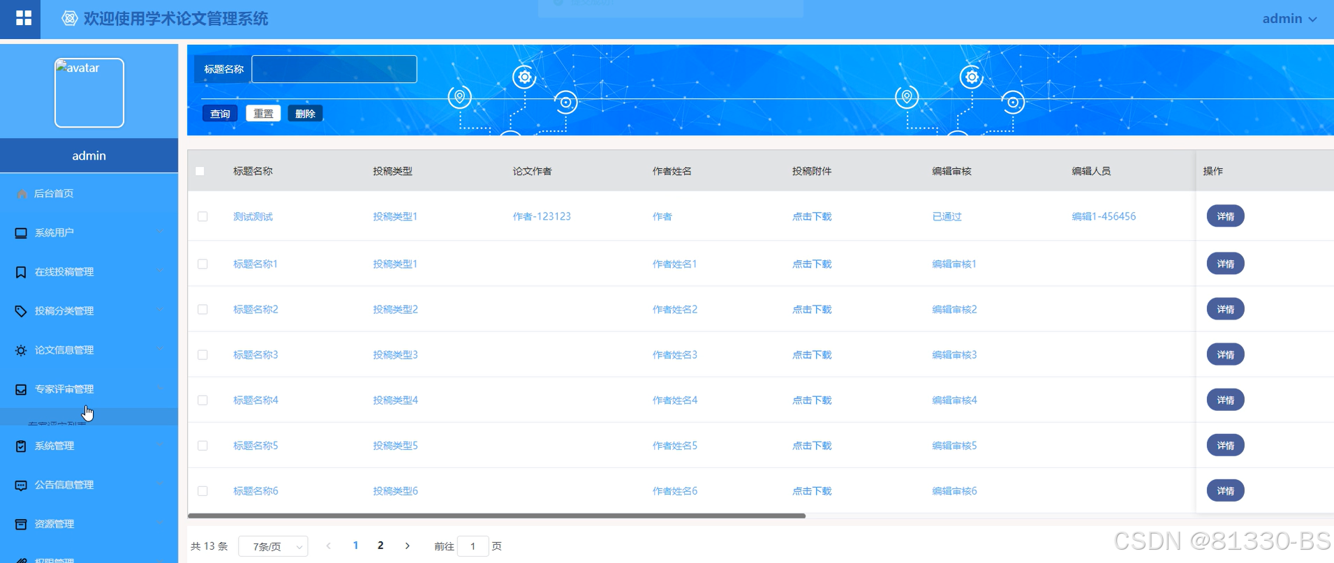 (5)专家评审管理:管理员点击“专家评审管理”会显示在线发布的所有的专家评审意见,可以进行查询、删除、添加(标题名称、投稿类型、论文作者、作者姓名、投稿附件、编辑审核、编辑人员)、进入详情查看等操作。