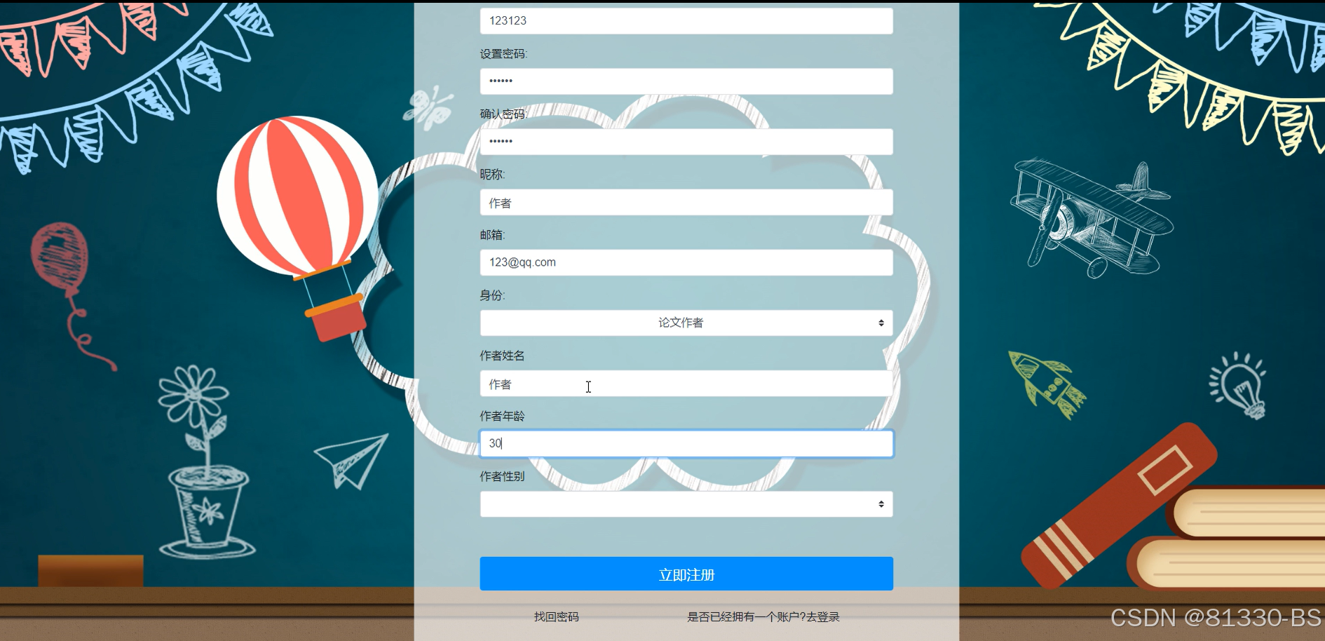 注册模块满足作者进行作者相关信息的查询管理的时候,就必须进行登录,如果没有账号的话,在登录界面,点击“注册”按钮就会跳转到注册的界面,根据提示填写好注册信息,添加提交,注册的信息在数据库中就添加完成了,然后再输入填写好的账号和密码进行登录,其主界面展示如下图4.1所示。