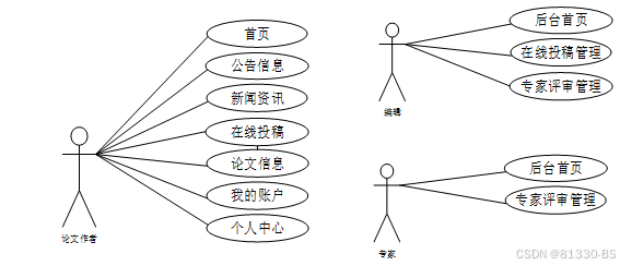 学术论文管理系统中论文作者、编辑、专家角色用例图如图2.4所示: