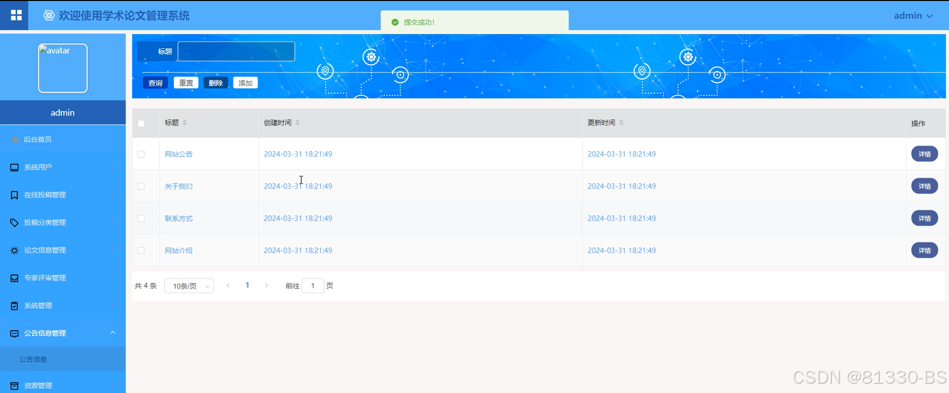 (5)公告信息管理:管理员点击“公告信息管理”会显示网站公告、关于我们、联系方式、网站介绍,可以对其进行查询、删除、添加、进入详情查看等操作。