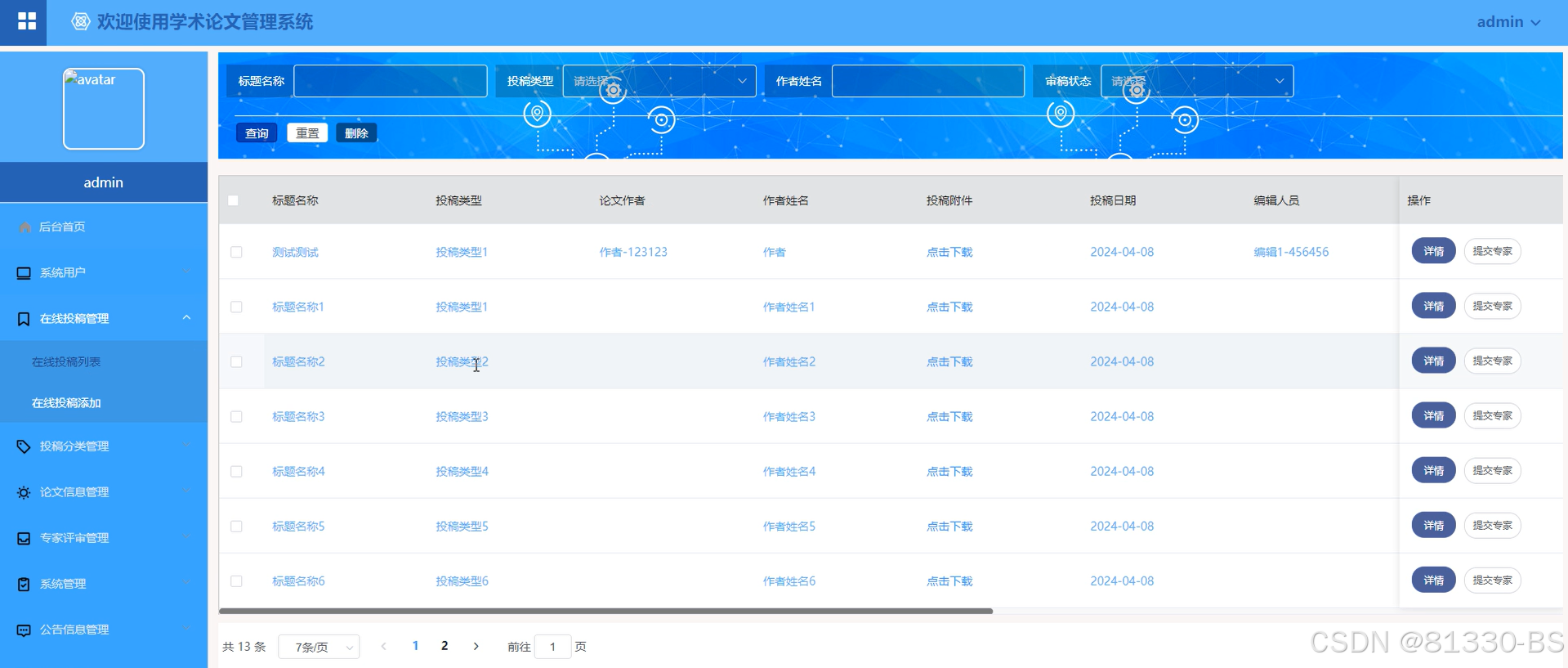 (2)在线投稿管理:管理员能够方便地对在线投稿进行管理,点击“在线投稿管理”会显示在线发布的所有的论文管理,可以进行查询、删除、添加(标题、投稿类型、论文作者、作者姓名、投稿附加、投稿日期、编辑人员等信息)、下载投稿附件、提交专家等操作。