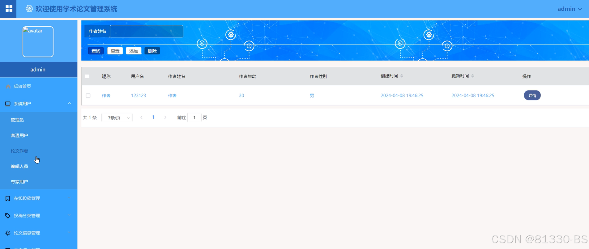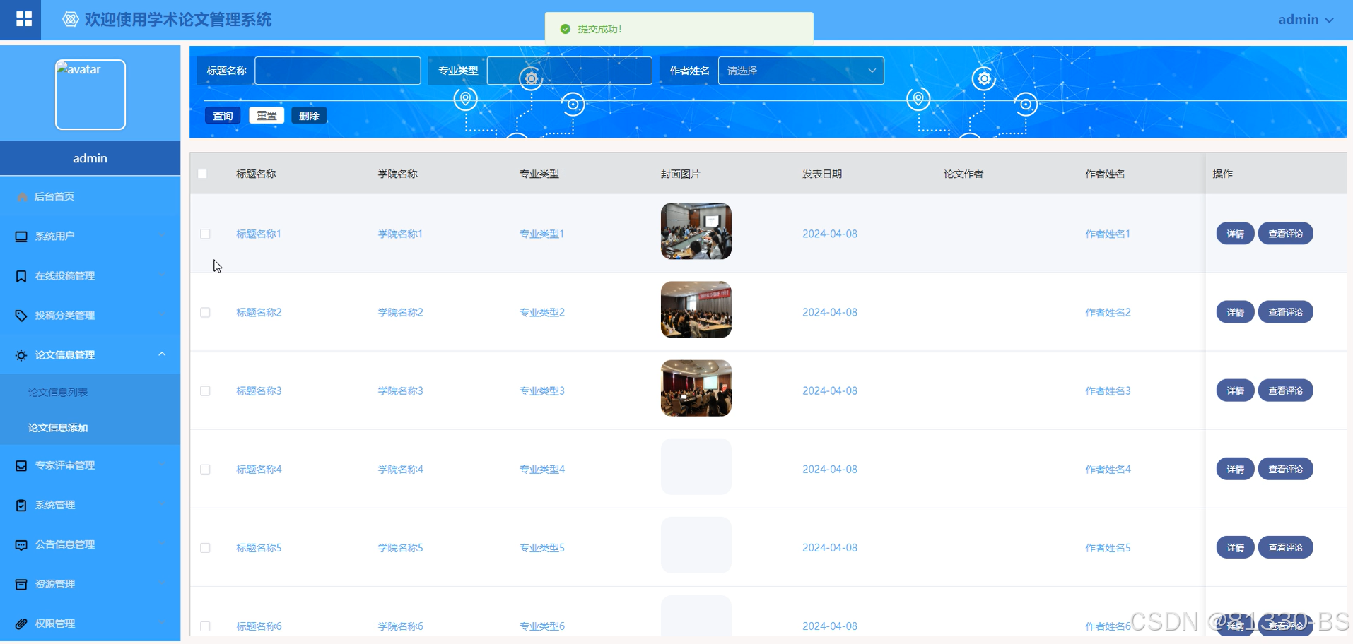 管理员点击“论文信息管理”会显示在线发布的所有的论文信息管理,可以进行查询、删除、添加(标题名称、学院名称、专业类型、封面图片、发表日期、论文作者、作者姓名)、进入详情查看和查看评论等操作,界面如下图4.6所示。