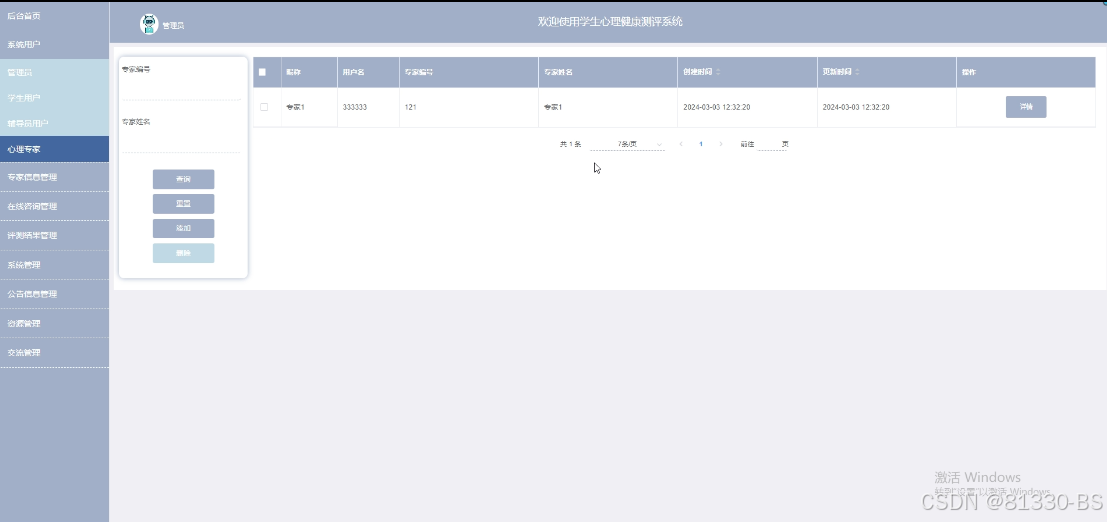 (3)专家信息管理:可查看所有专家信息,进行增改删查操作,支持专家姓名、专家性别搜索,点击可查看详情(心理专家、专家姓名、专家性别、联系方式、辅导领域、排班时间、从业履历、个人介绍),并进行查看评论操作。