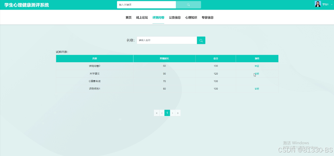 (4)测评问卷:可查看所有评测问卷信息,支持名称搜索,查看列表信息(名称、答题时长),可点击进行答题操作
