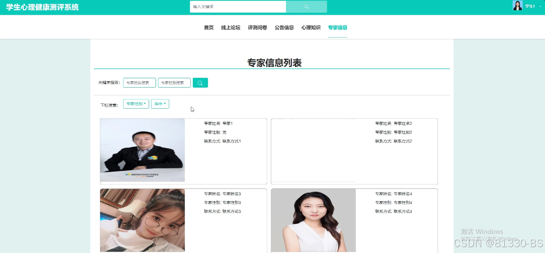 (6)专家信息:可查看所有专家信息,支持关键字(专家姓名、专家性别)搜索,点击可查看详情(心理专家、专家姓名、专家性别、联系方式、辅导领域、排班时间、从业履历、个人介绍),并进行点赞、收藏和评论。