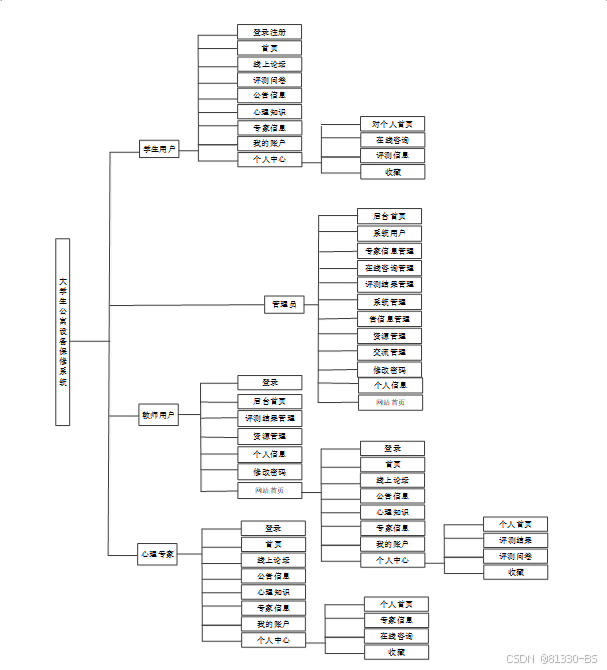 springboot学生心理健康测评系统针对用户需求进行划分,主要分为学生用户、辅导员用户、心理专家和管理员四大模块,辅导员用户可登录进入前后端界面,使用系统功能,提供了丰富的功能,具体功能分析如下: