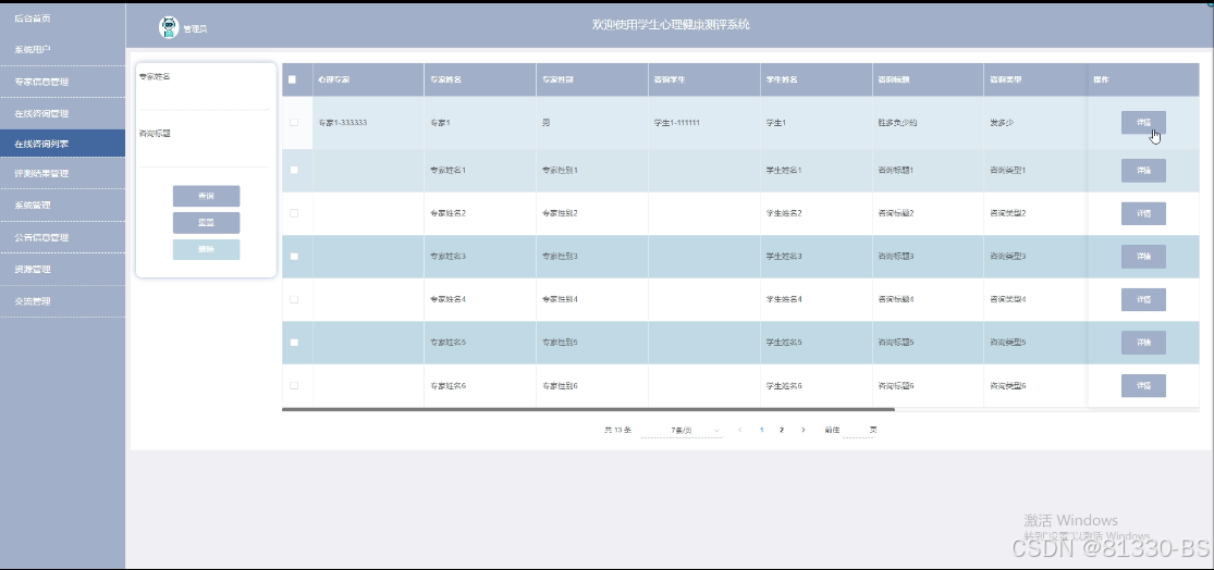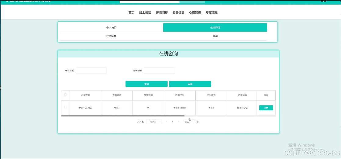 (4)在线咨询管理:可查看所有学生提交的在线咨询信息,进行增改删查操作,支持专家名字、咨询标题搜索,可点击查看详情。