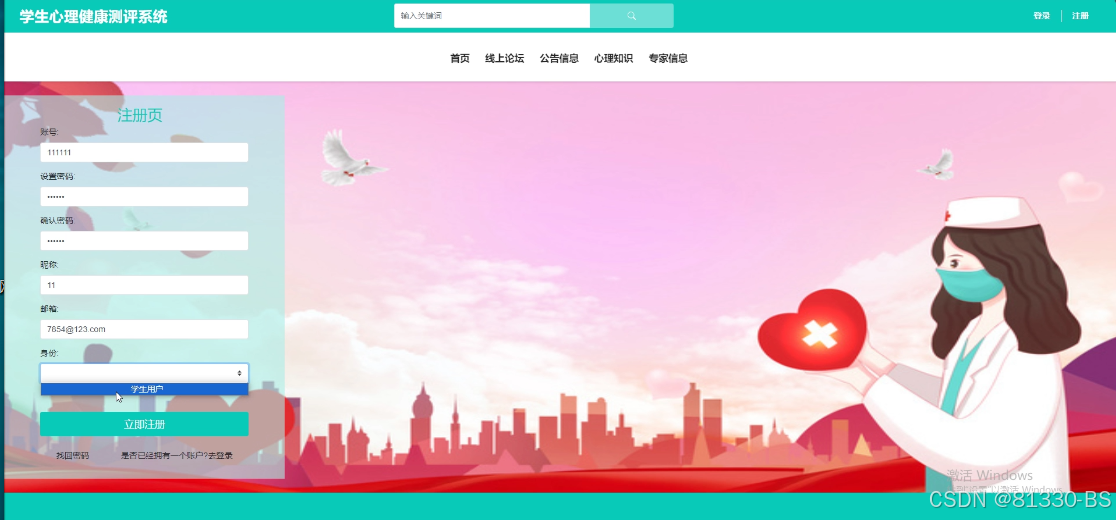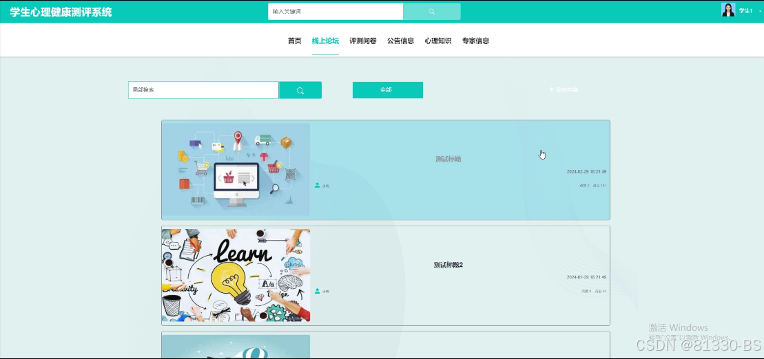 基于springboot的学生心理健康测评系统的设计与实现具有较高的实践意义和应用价值。该系统旨在提供一个学生心理健康管理平台,提高学生心理健康管理效率,以便学校能够更好地及时把握学生心理状况。为学生提供心理健康支持服务,包括在线咨询和心理知识的获取,能够及时解决学生的心理问题和提高学生的心理水平。能够进行线上评测问卷答题,通过学生的评测结果,学校能够了解学生的心理状况,以便当学生出现心理问题时,学校进行精准干预。实现线上论坛的功能,方便用户之间的信息交流提高用户的交互。