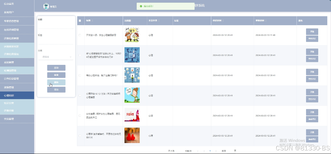 可对心理知识、知识分类和评测问卷进行管理,可看到所有心理知识、知识分类和评测问卷信息,并进行增删改查操作,其中心理知识支持标题、标签、分类搜索,可点击查看详情(封面图、标题、分类、标签、描述、正文)和查看评论;知识分类支持类型名称搜索,可点击查看详情;评测问卷支持名称搜索,可点击查看详情操作,并进行测评、答题、评分。界面如下图所示。