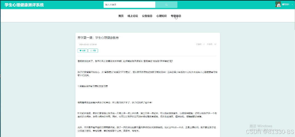 (5)心理知识:可查看所有心理知识信息,支持局部搜索,点击可查看详情,并进行点赞、收藏和评论。