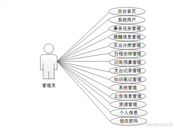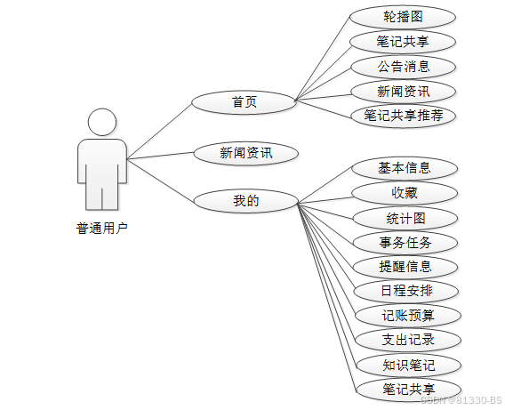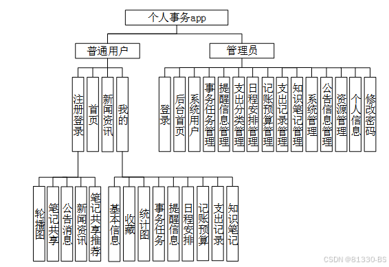通过对个人事务app的需求分析,该系统主要分为普通用户和管理员两大功能模块。具体如下: