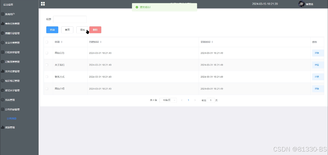 可对公告消息进行管理,进行增删改查操作,支持标题搜索,可点击查看详情。界面如下图所示。