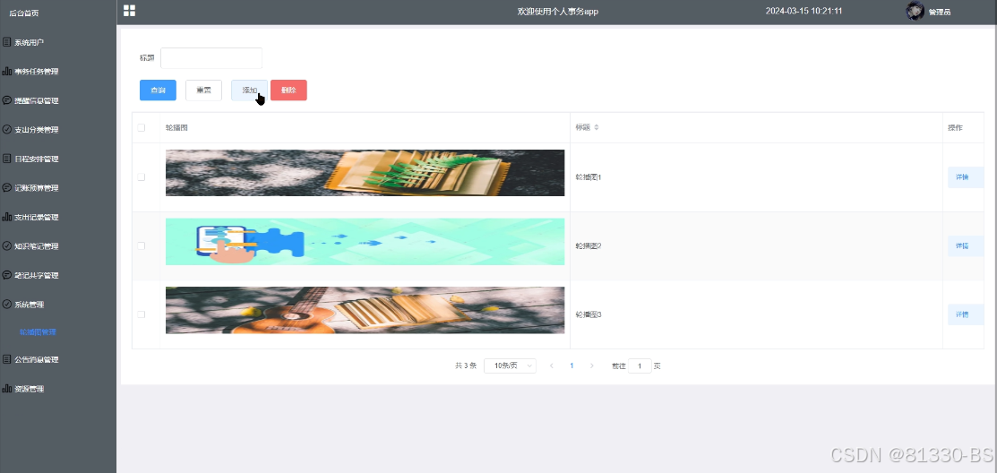 (12)系统管理:可对首页轮播图进行管理,进行增删改查操作,支持标题搜索,可点击查看详情。