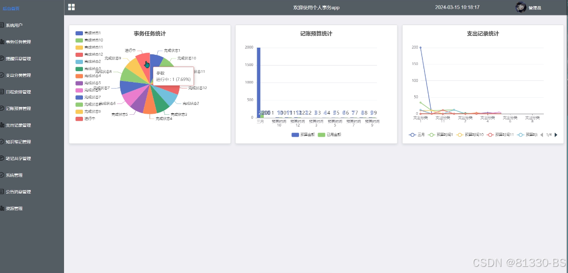 (2)后台首页:可查看事务任务统计、记账预算统计、支出记录统计等统计信息数据分析图表。