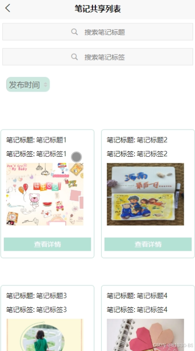 ① 点击“笔记共享”,可查所有笔记共享信息,支持笔记标题、笔记标签搜索,和排序(发布时间)搜索,可点击查看详情(笔记标签、普通用户、笔记标题、笔记内容、笔记图片),可进行收藏。