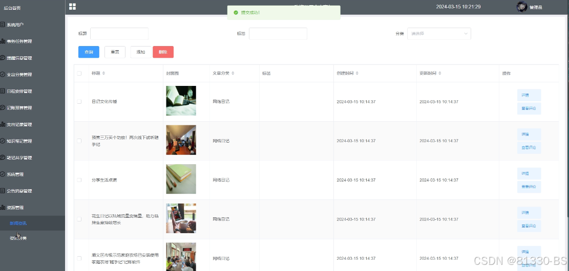 可对新闻资讯和资讯分类进行管理,进行增删改查操作,新闻资讯支持标题、标签、分类搜索,可点击查看详情(封面图、标题、分类、标签、描述、正文)和查看评论;资讯分类支持类型名称搜索,可点击查看详情。界面如下图所示。