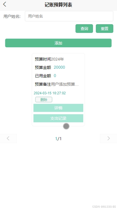 ⑦ 点击“记账预算”,可查看自己的记账预算信息,进行增改删查操作,支持用户姓名搜索,可点击查看详情(普通用户、用户姓名、预算时间、预算金额、已用金额、预算备注),并可点击支出记录操作,填写并提交支出记录信息(支出分类、支出时间、支出金额、支出备注)。