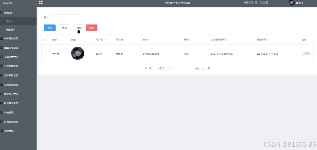 (3)系统用户:可对普通用户和管理员进行管控,包括进行增删改查操作,点击可查看详情。