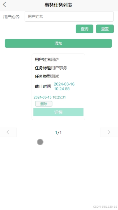 (4)事务任务管理:可查看所有事务任务信息,进行增改删查操作,支持用户姓名搜索,可点击查看详情(普通用户、用户姓名、任务标题、任务类型、截止时间、任务内容、完成状态),并可点击提醒操作,填写并提交提醒信息(提醒时间)。