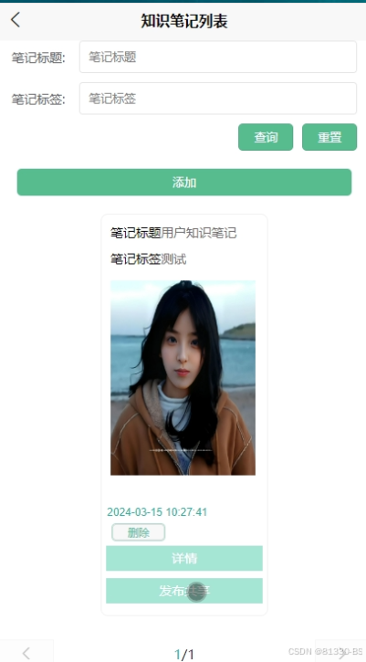 (10)知识笔记管理:可查看所有知识笔记信息,进行增改删查操作,支持笔记标题、笔记标签搜索,可点击查看详情(普通用户、用户姓名、笔记标题、笔记标签、记录时间、笔记内容、笔记图片)。