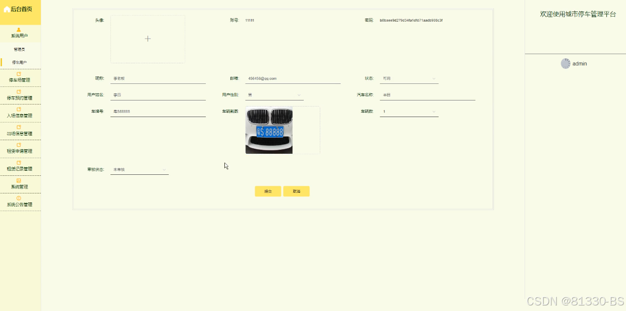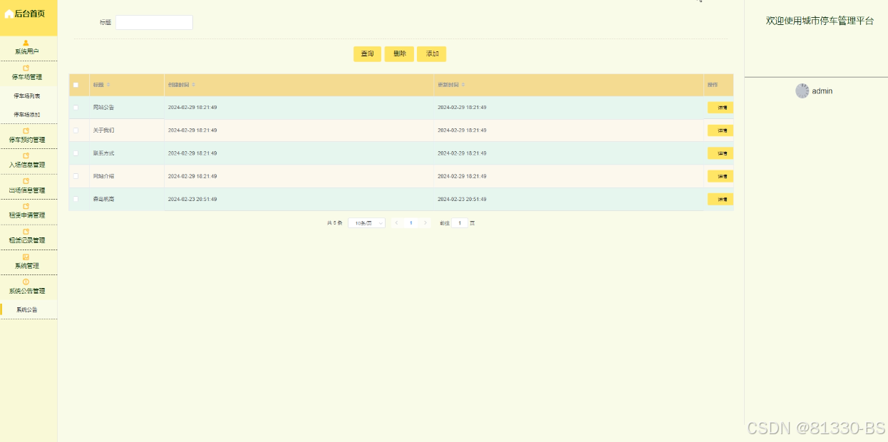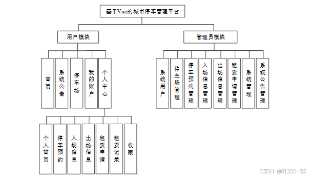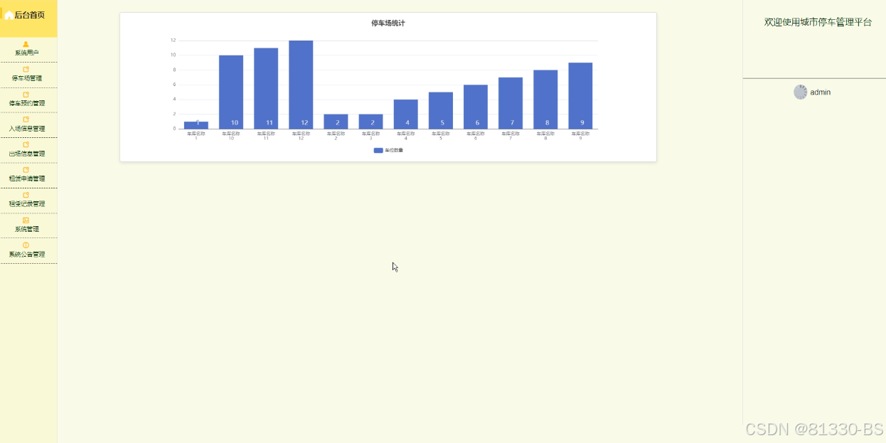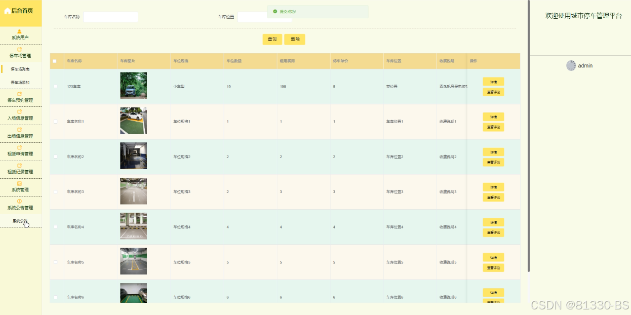 城市停车管理平台的开发目的很简单,就是更加方便的帮助车主用户更轻松地查询到停车场信息,并进行停车预约、租赁申请操作。管理员后台实现对系统用户、停车场管理、停车预约管理、入场信息管理、出场信息管理、租赁申请管理、系统管理、系统公告管理等功能模块的信息管理,使用者查找信息的时候能够节省大量的时间和精力,有效减少不必要的查找时间。系统在功能上划分为用户端和管理员端两部分。