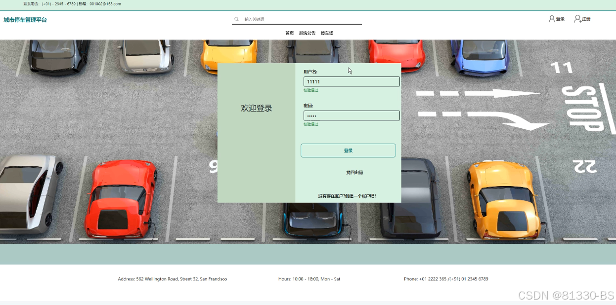 The system uses SpringBoot and Vue as front-end and back-end development frameworks, combined with development technologies such as MySQL and Java, to achieve the addition, modification, viewing, and deletion of system data. This system adopts a componentized approach to split the system, and analyzes and designs the addition, deletion, querying, and modification of various tables in the database, as well as the constraint relationships between tables. Ultimately, it achieves a commercial level application that meets user needs. This system realizes the computerized management of various workflow processes within the urban parking management platform, including system users for administrators, parking lot management, parking reservation management, entry information management, exit information management, lease application management, system management, system announcement management, and other functions.