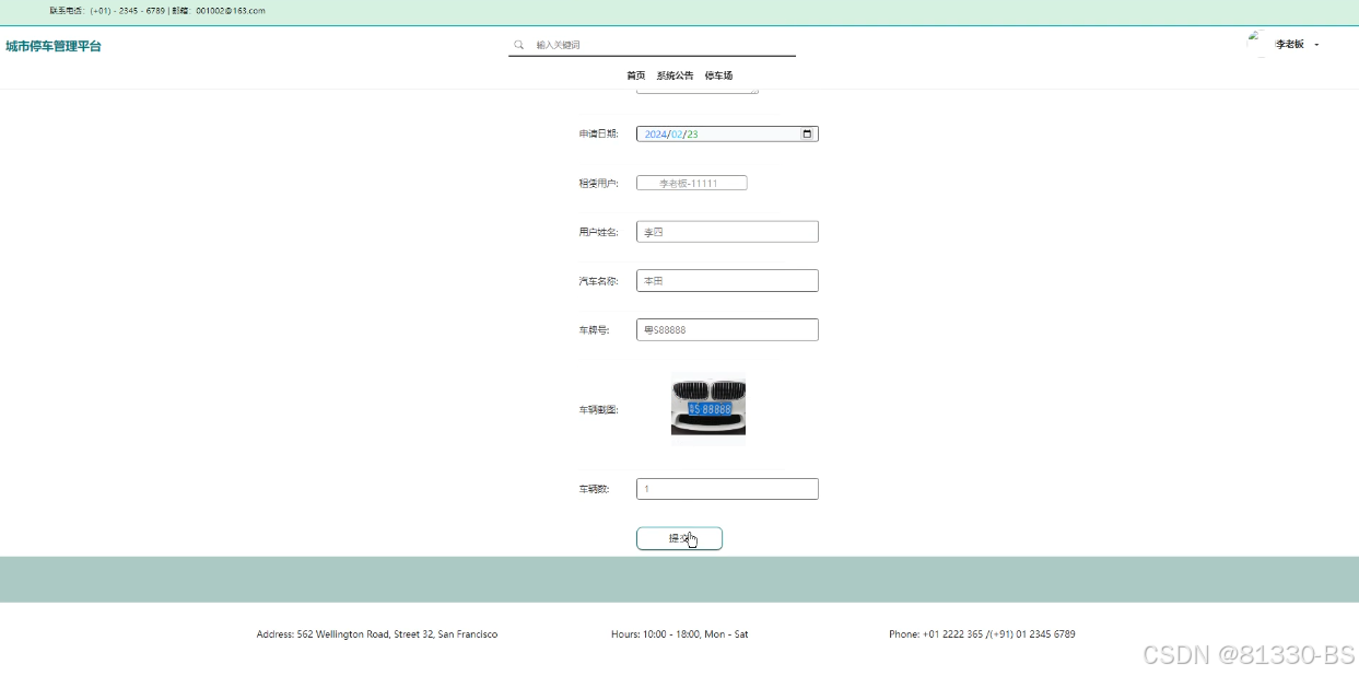 1)搜索查看停车场信息,点击租赁申请。 2)填写租赁申请信息,点击进行提交。 |