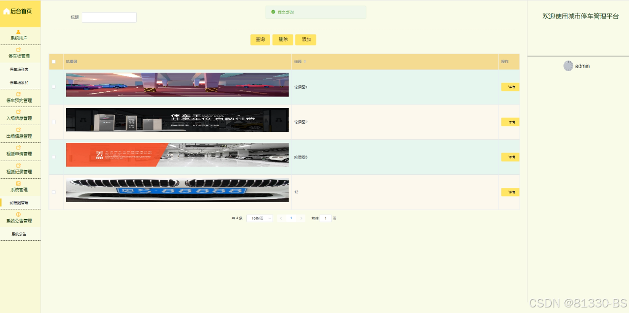 管理人员在“系统管理”这一菜单下是可以对城市停车管理平台内的轮播图进行添加修改的,其管理界面如下图4-13所示。
