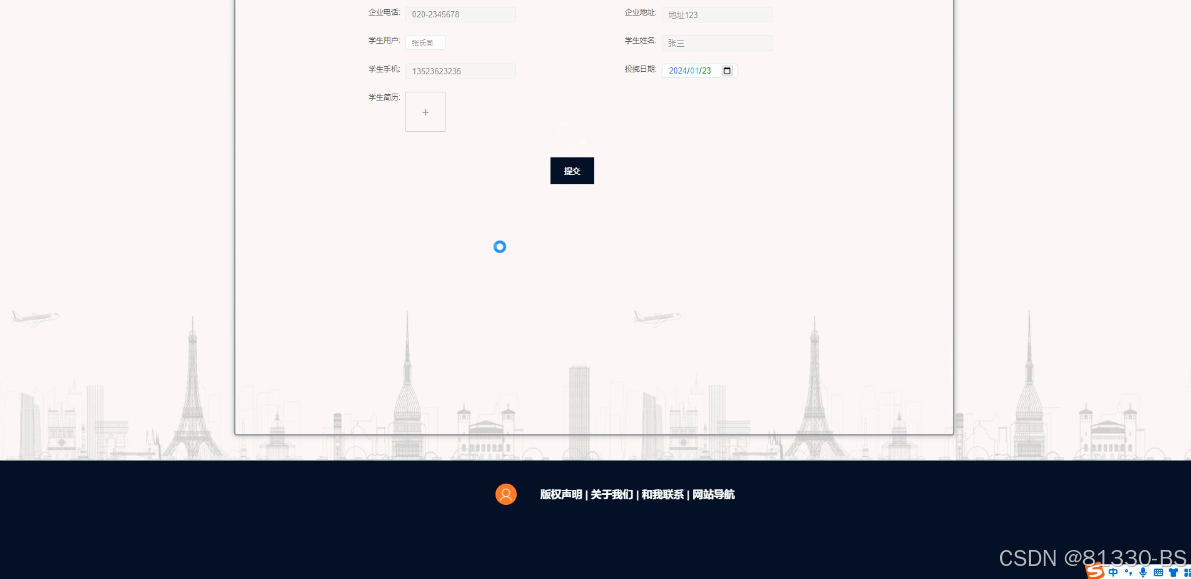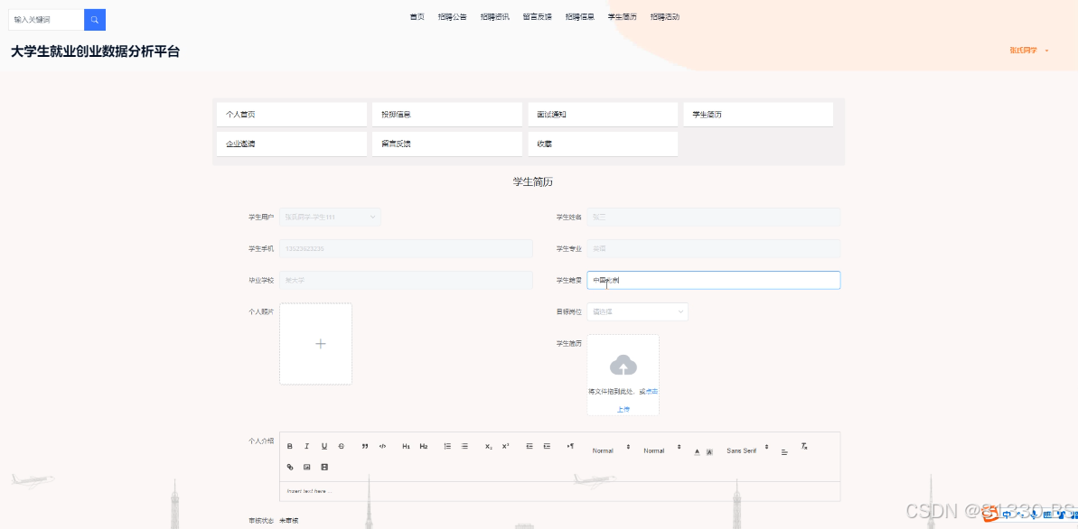 用户通过登录系统后点击“学生简历”,便可以查看系统所有的学生简历列表,也可以进入到个人中心进行简历修改。