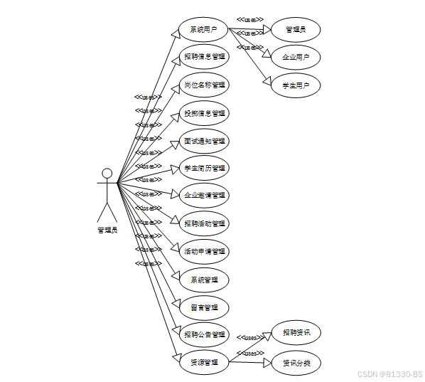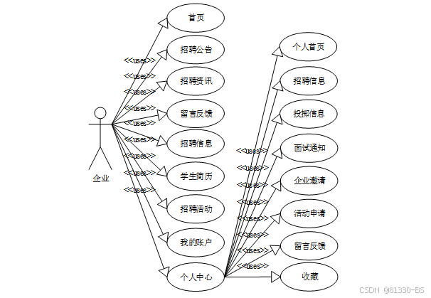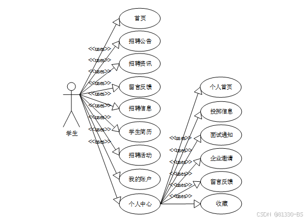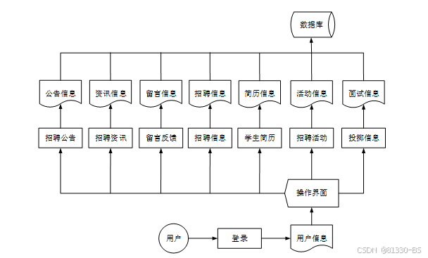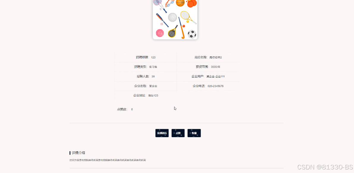 浏览招聘信息:用户可以根据职位类型浏览招聘的信息,并选中某个招聘信息查看详情,例如:招聘标题、岗位名称、招聘类型、薪资范围、招聘人数、企业用户、企业名称、企业电话、企业地址等。