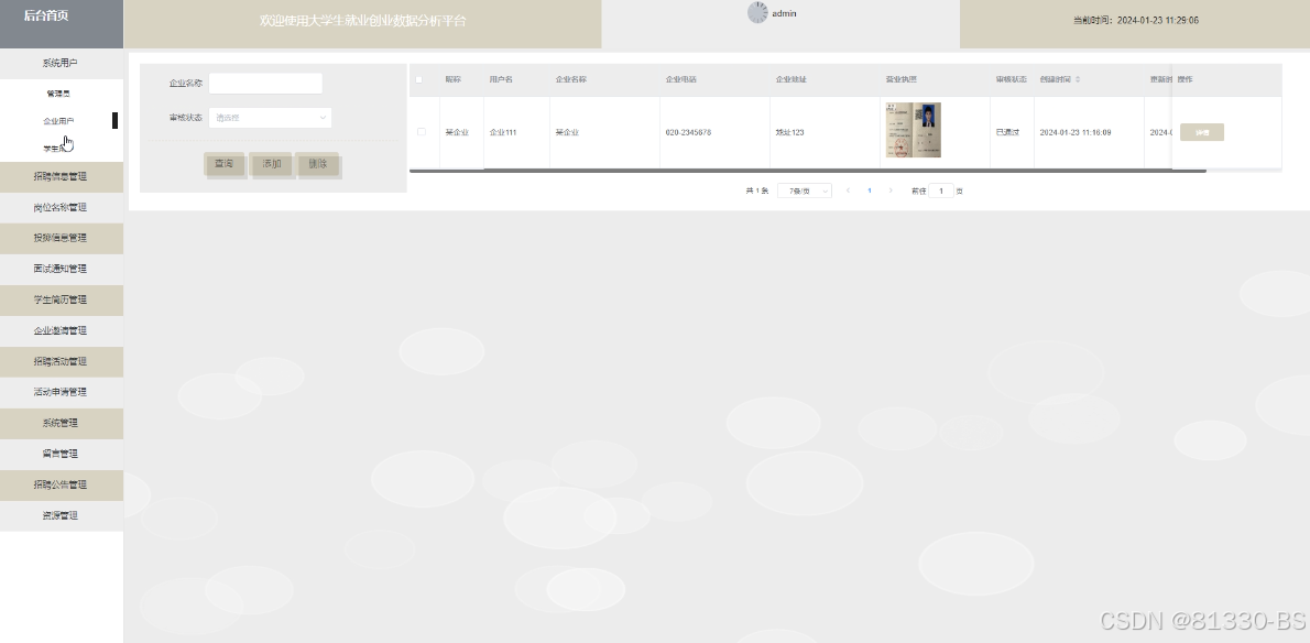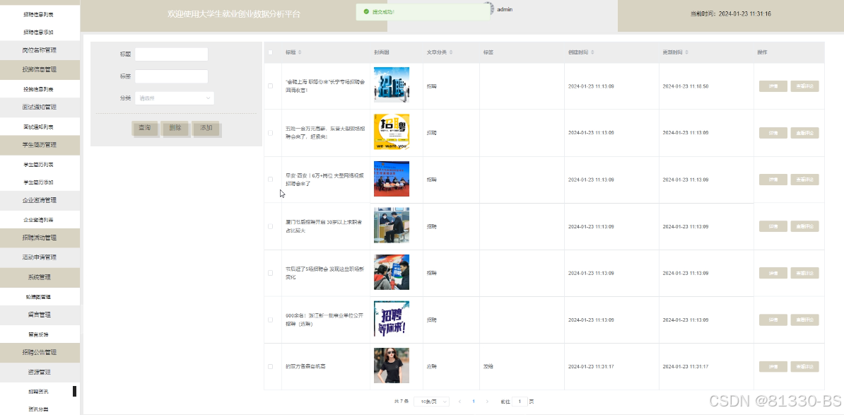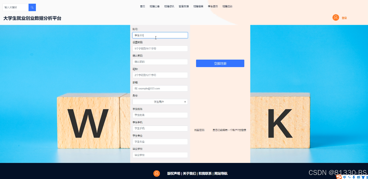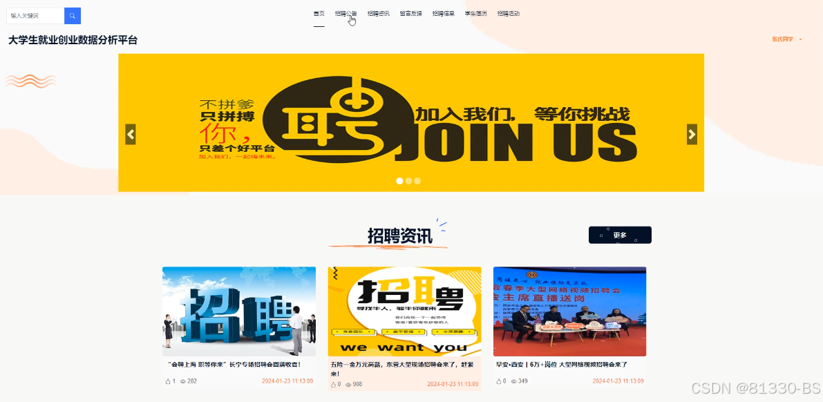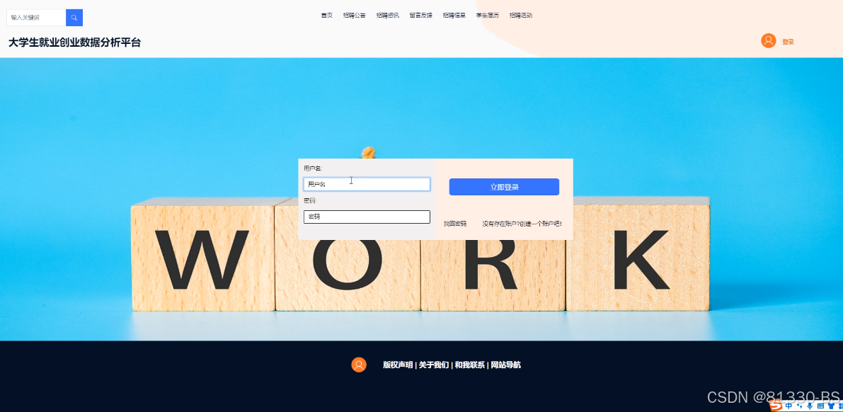 大学生就业创业数据分析平台的前台页面简洁易懂,无论是系统管理员还是普通用户,只要电脑连接到网络,就可以轻松访问网站,而且不需要任何操作指导,只要输入正确的URL地址,就可以轻松完成所有的操作。由于无需任何复杂的环境配置,这个系统非常简单,易于操作,因此它是一个非常实用的工具。