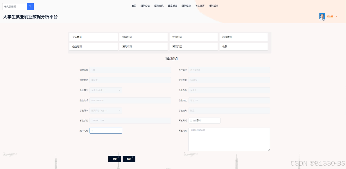 添加面试通知请是在“查询投掷信息 “的前提下操作的。当页面显示查询的投掷信息后,可以对学生投掷信息发出面试邀请。