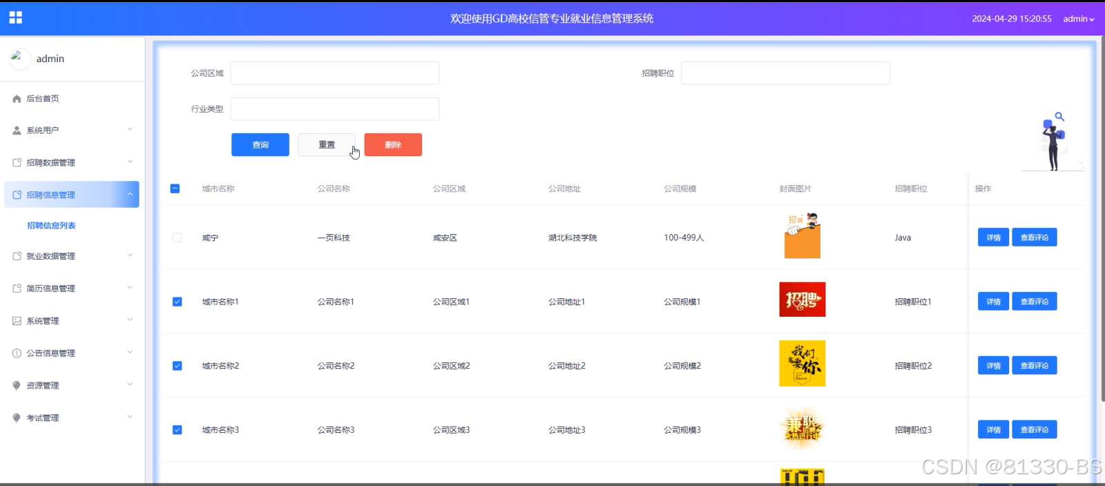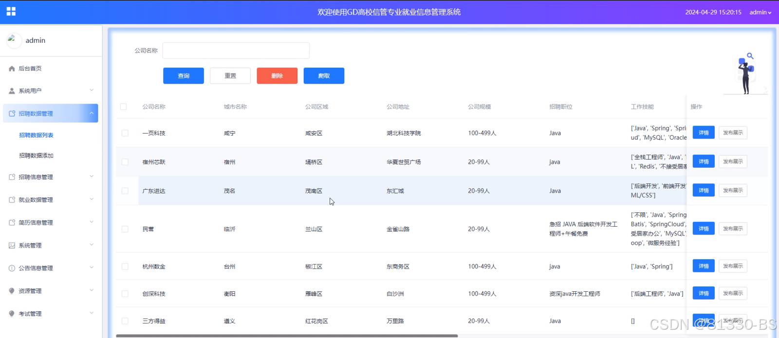 (5)招聘信息管理:招聘信息管理模块允许管理员查询、删除、查看详情和查看评论。管理员可以通过这个模块来管理平台上的招聘信息,确保信息的真实性和合法性。