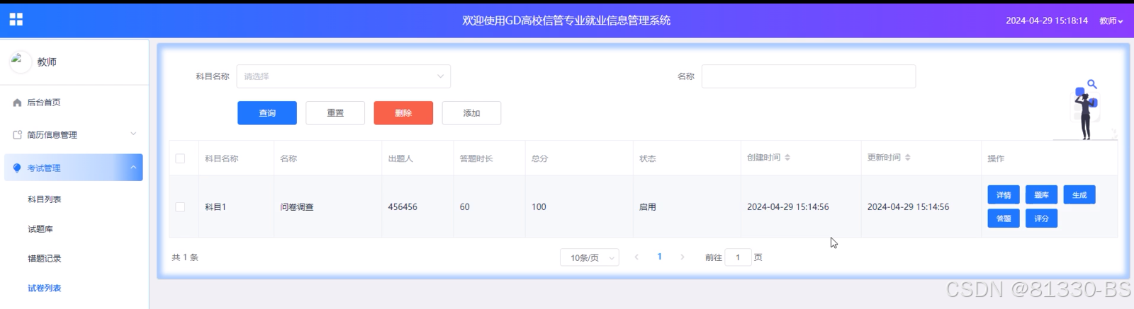 l试卷列表:则提供了试卷的添加、查看、重置、删除等操作,同时支持查看学生试卷并进行评分。教师还可以点击生成按钮,从试题库中抽取题目自动生成试卷,大大提高了工作效率。