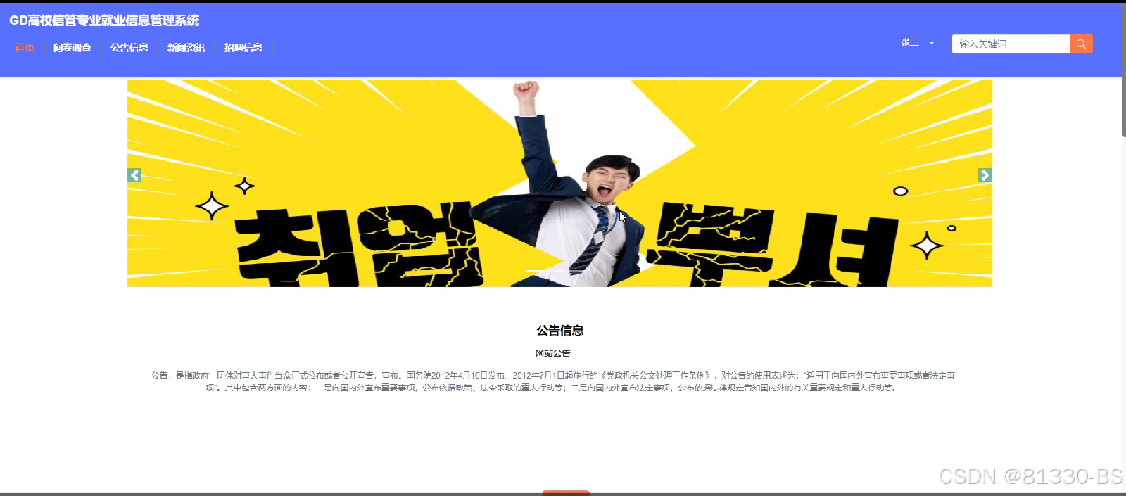 高校信管专业就业信息管理系统的前台页面简洁易懂,无论是系统管理员还是学生用户,只要电脑连接到网络,就可以轻松访问网站,而且不需要任何操作指导,只要输入正确的URL地址,就可以轻松完成所有的操作。由于无需任何复杂的环境配置,这个系统非常简单,易于操作,因此它是一个非常实用的工具。
