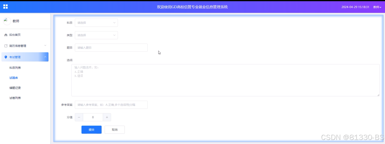l试题库:为教师提供了丰富的试题资源,支持添加、查看、重置和删除试题。教师可以根据教学进度和考试需求,从试题库中挑选合适的题目,构建个性化的试卷。