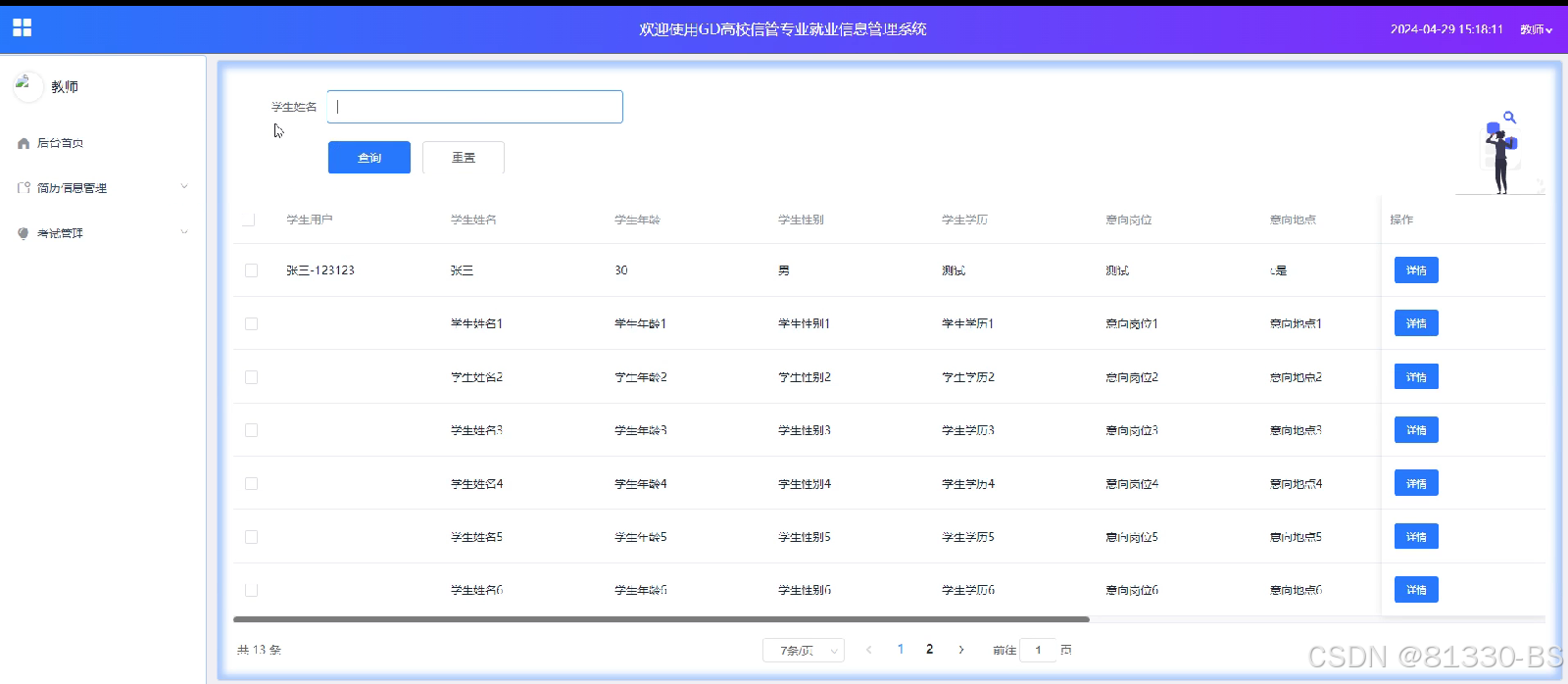 (3)简历信息管理:此功能允许教师查看学生的简历信息,包括基本信息、学习经历等。教师可以随时了解学生的背景资料,为个性化教学提供参考。