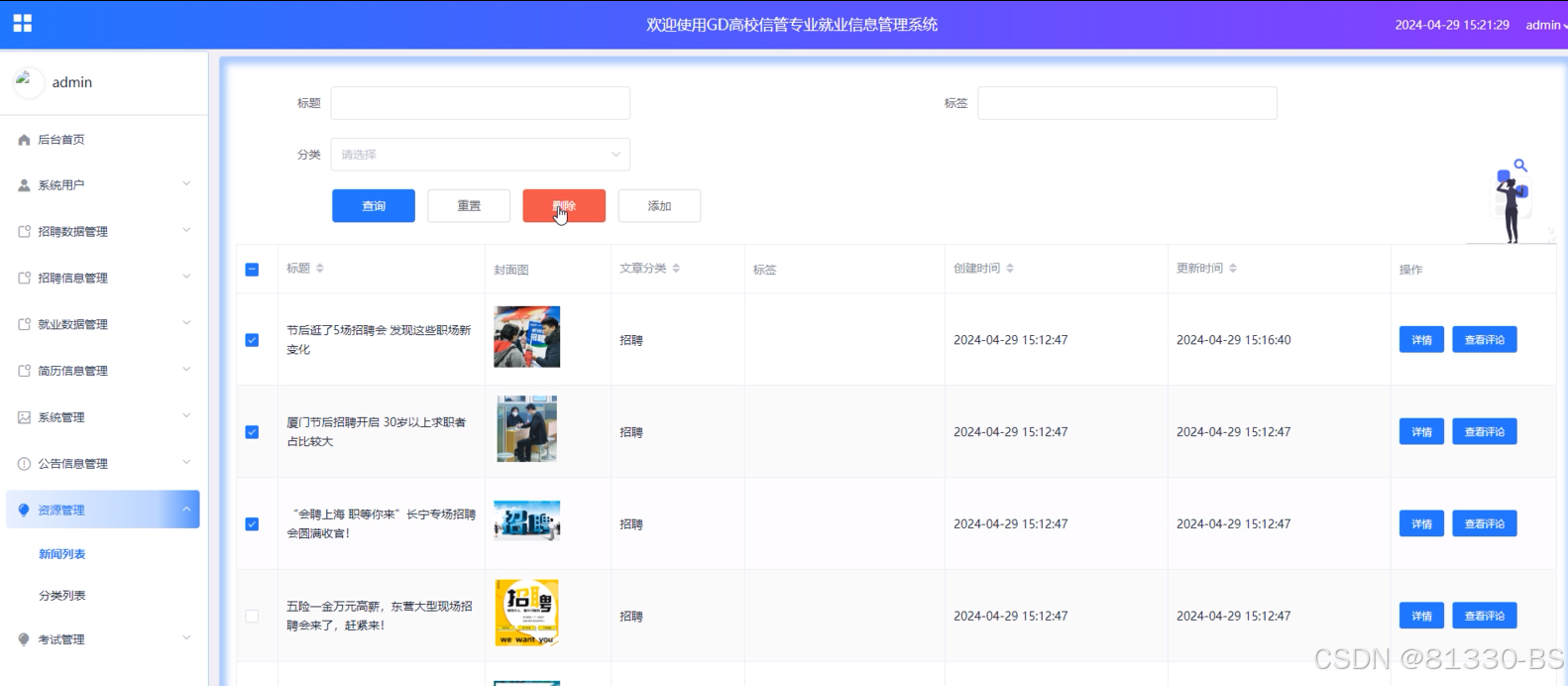 管理员点击“资源管理”菜单能够对高校信管专业就业信息管理系统内的新闻列表及其新闻分类信息进行增删改查。