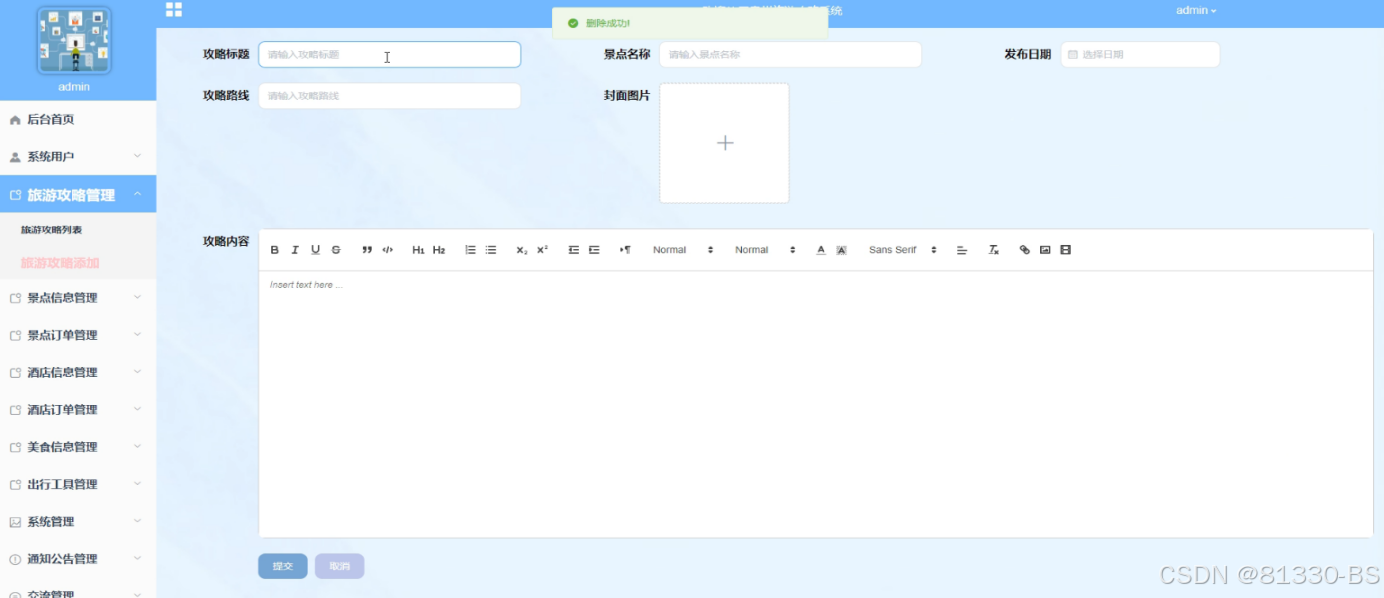 旅游攻略管理:管理员可以添加、删除、查询和编辑旅游攻略,同时查看相关的评论和用户反馈,以确保信息的准确性和完整性。界面如下图所示。