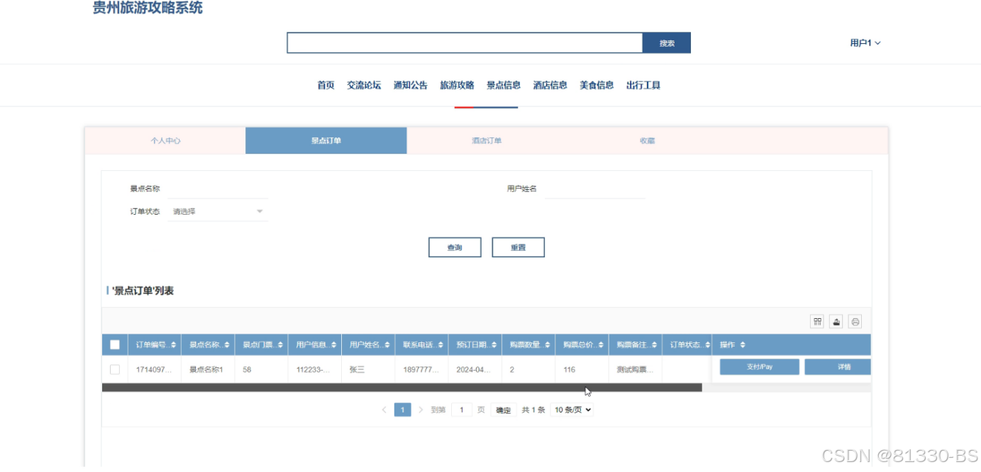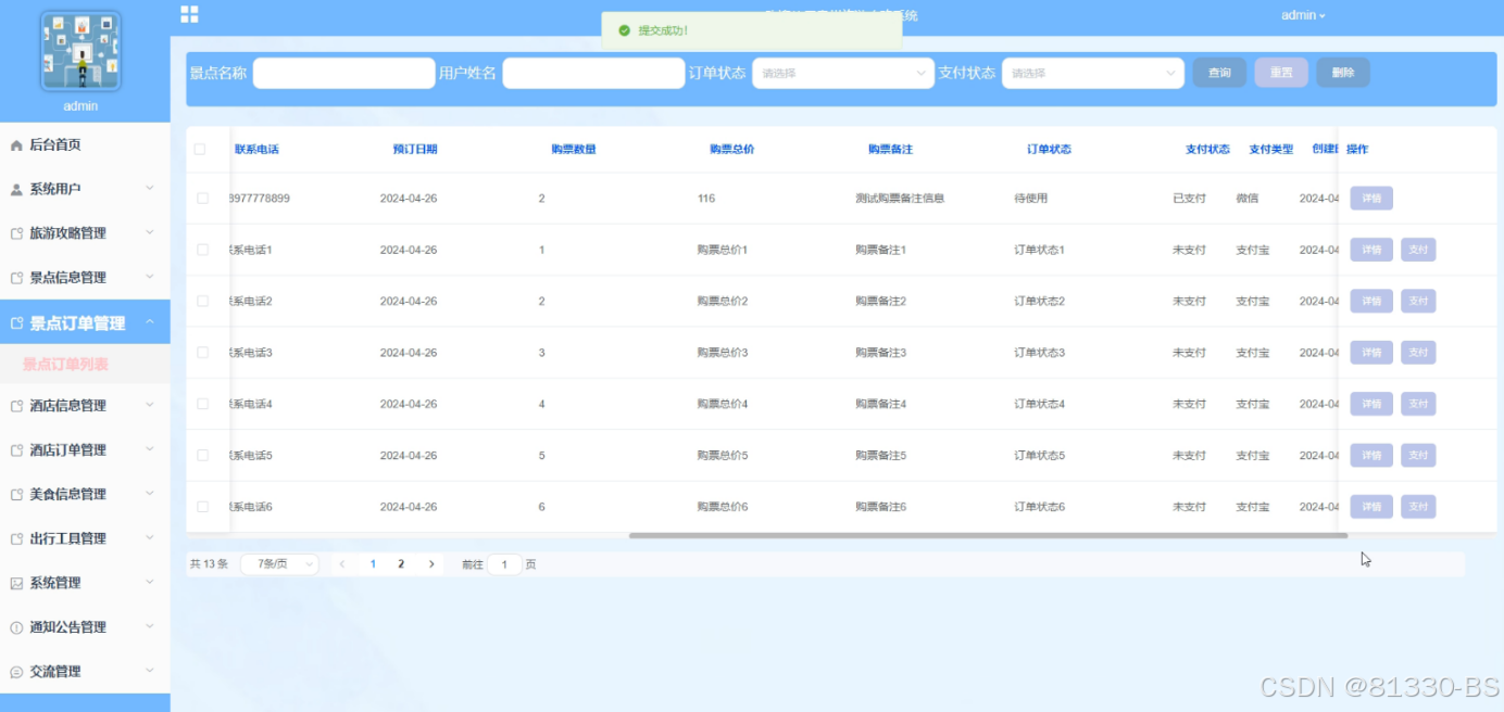 景点订单管理:管理员可以查询和编辑景点的订单信息,包括订单详情、支付状态等,同时也可以处理用户的支付请求。界面如下图所示。