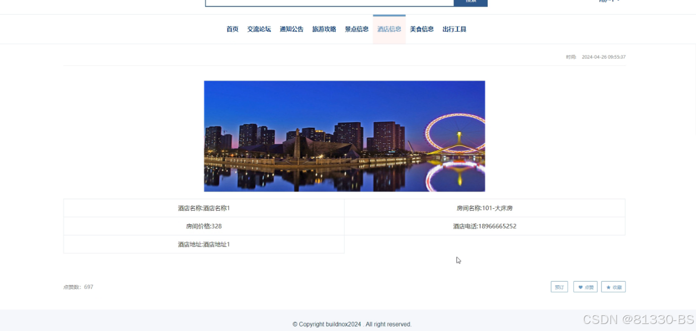 (7)酒店信息:酒店信息模块提供了丰富的酒店选择,用户可以根据自己的需求搜索和预订合适的酒店,同时也可以通过点赞、收藏和评论等方式与其他用户分享酒店的使用体验。